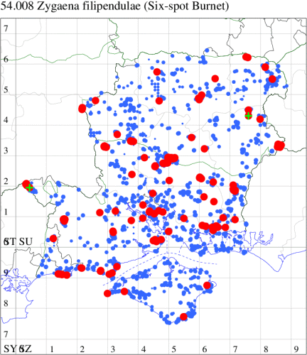 VC12: Earliest: Bramshott Common, 12 May, 1 (AGre) Latest: Warren Hill, Tidworth, 20 Aug, 1 (AJB) Max count: Magdalen Hill Down NNR, 30 Jul, 20 (DSte)
