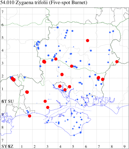 Local on grassland and heathland, and by freshwater margins, throughout much of southern England and Wales. In Hampshire not as widespread as in the past, but still locally present, generally on the chalk, and relatively frequent on the Isle of Wight. Wingspan 24-37 mm. Day-flying. Very difficult to distinguish from the much more widespread Narrow-bordered Five-spot Burnet Z. lonicerae, even using features of genitalia: however, the habitat, time of year and location may help; slightly smaller than Narrow-bordered; examples with the middle pair of spots merged are frequent in Five-spot Burnet, but rare in Narrow-bordered (MBGBI Vol 2). It is very difficult to make a determination based on one individual from photos. Larva feeds on Greater Bird's-foot Trefoil.